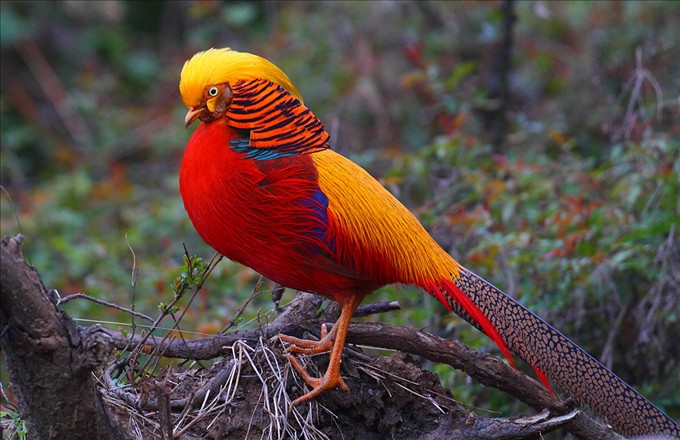 習(xí)性:紅腹錦雞(又名金雞)棲息于海拔500—2500米的多林地帶。群居,日行性,視、聽覺敏銳,性機警,稍有異常立即逃遁。留鳥。以植物葉、芽、花、果實、種子、谷物等為食,繁殖期進食昆蟲、蠕蟲等動物性食物。